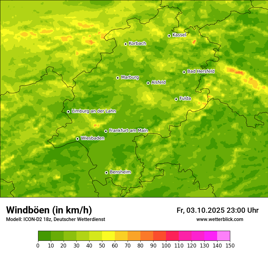 Es treten Windböen mit Geschwindigkeiten zwischen 50 km/h (14 m/s, 28 kn, Bft 7) und 60 km/h (17 m/s, 33 kn, Bft 7) anfangs aus südlicher, später aus westlicher Richtung auf. In Schauernähe sowie in exponierten Lagen muss mit Sturmböen bis 70 km/h (20 m/s, 38 kn, Bft 8) gerechnet werden.