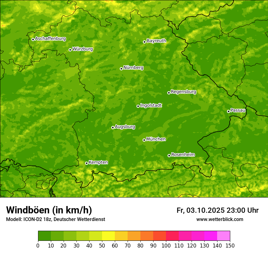 Es treten Windböen mit Geschwindigkeiten zwischen 50 km/h (14 m/s, 28 kn, Bft 7) und 60 km/h (17 m/s, 33 kn, Bft 7) anfangs aus südwestlicher, später aus westlicher Richtung auf. In Schauernähe sowie in exponierten Lagen muss mit Sturmböen bis 70 km/h (20 m/s, 38 kn, Bft 8) gerechnet werden.