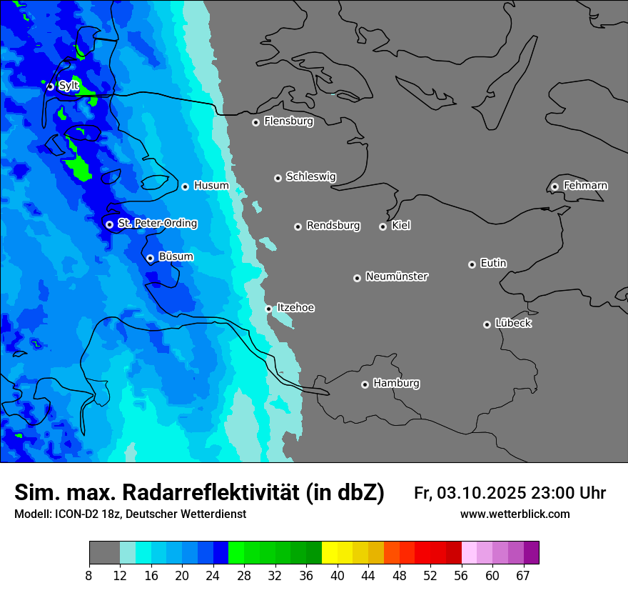 Es treten Sturmböen mit Geschwindigkeiten bis 75 km/h (21 m/s, 41 kn, Bft 9) anfangs aus südlicher, später aus südwestlicher Richtung auf. In Schauernähe sowie in exponierten Lagen muss mit schweren Sturmböen bis 90 km/h (25 m/s, 48 kn, Bft 10) gerechnet werden.