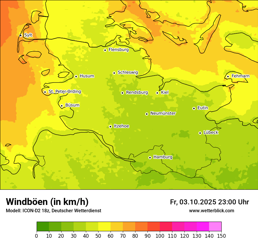 Es treten Windböen mit Geschwindigkeiten bis 60 km/h (17 m/s, 33 kn, Bft 7) anfangs aus südlicher, später aus südwestlicher Richtung auf. In Schauernähe sowie in exponierten Lagen muss mit Sturmböen bis 75 km/h (21 m/s, 41 kn, Bft 9) gerechnet werden.