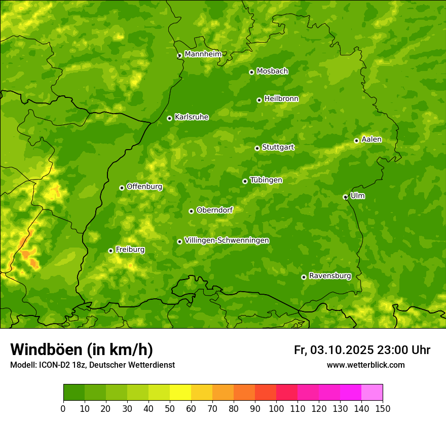 Es treten Windböen mit Geschwindigkeiten zwischen 50 km/h (14 m/s, 28 kn, Bft 7) und 60 km/h (17 m/s, 33 kn, Bft 7) anfangs aus südwestlicher, später aus westlicher Richtung auf. In Schauernähe sowie in exponierten Lagen muss mit Sturmböen bis 70 km/h (20 m/s, 38 kn, Bft 8) gerechnet werden.