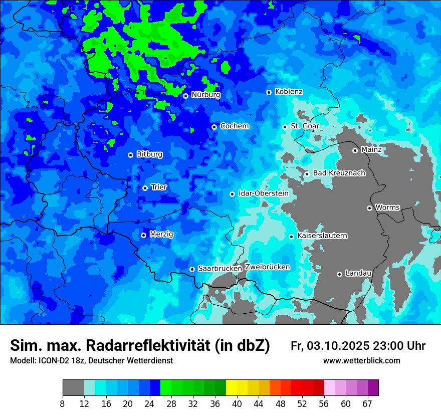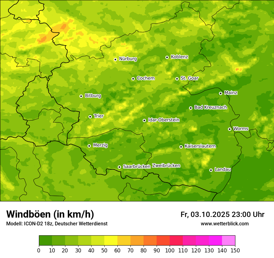 Es treten Windböen mit Geschwindigkeiten zwischen 50 km/h (14 m/s, 28 kn, Bft 7) und 60 km/h (17 m/s, 33 kn, Bft 7) anfangs aus südlicher, später aus westlicher Richtung auf. In Schauernähe sowie in exponierten Lagen muss mit Sturmböen bis 70 km/h (20 m/s, 38 kn, Bft 8) gerechnet werden.
